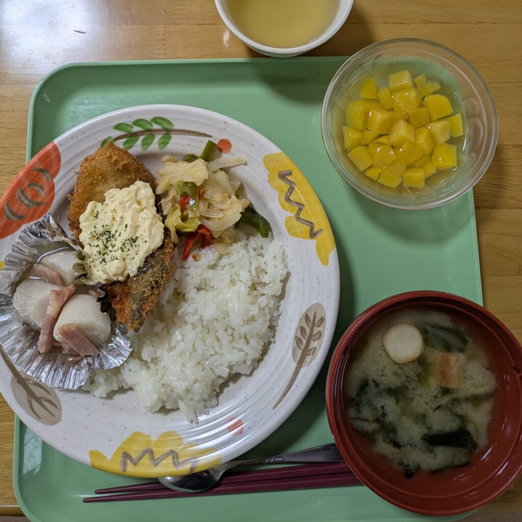 外はカリッと揚がった衣、中はふっくらジューシーなサーモンに、手作りのタルタルソースをたっぷりと添えました✨