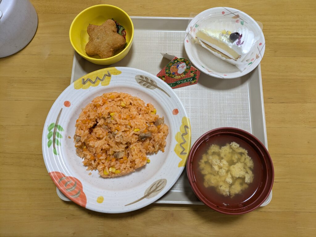 トレイに乗ったチキンライスは、ケチャップ🍅の鮮やかな赤色がとっても美味しそう。