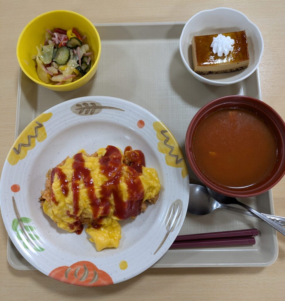 メインのオムライス、爽やかなサワーサラダ、体を温めるミネストローネ、そして締めくくりのキャラメルケーキ。